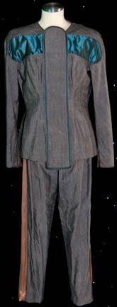 A costume featured in the Star Trek: The Next Generation episode “Reunion” for wear by Suzie Plakson in her role as “K'Ehleyr”. The costume is a set of gray colored trousers with tan stripes down the outside seams and a matching top with blue piping. The costumer’s tag reads #181 … |