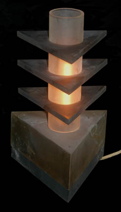 A small triangularly shaped table lamp with a working light system. Activated through the use of a standard two prong 120volt electrical cable with a three setting dial switch (low, bright, and off) this lamp features a triangle base with a centrally located inset for attachment of a translucent plastic … |