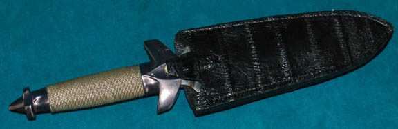 A prop knife and sheath featured in Star Trek X: Nemesis for use by “Shinzon” (Tom Hardy). The item is a metal dagger with a centrally separated blade and beveled edges to appear sharp, with an oil slick style paint on the ‘blade' and gold colored wire wrapped around the … |