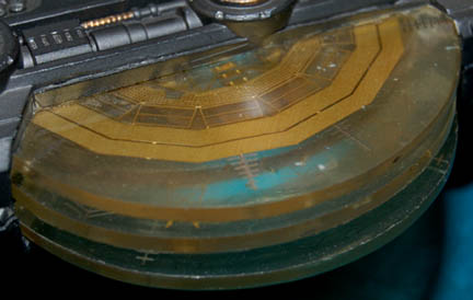 An impressive cast resin “synaptic scanner” used in various Star Trek episodes including Star Trek: The Next Generation, Deep Space Nine, and Voyager. The piece is painted metallic pewter with gold accents and faux green and red lights. Two bands of blue leather with gold thread join the two ends … |