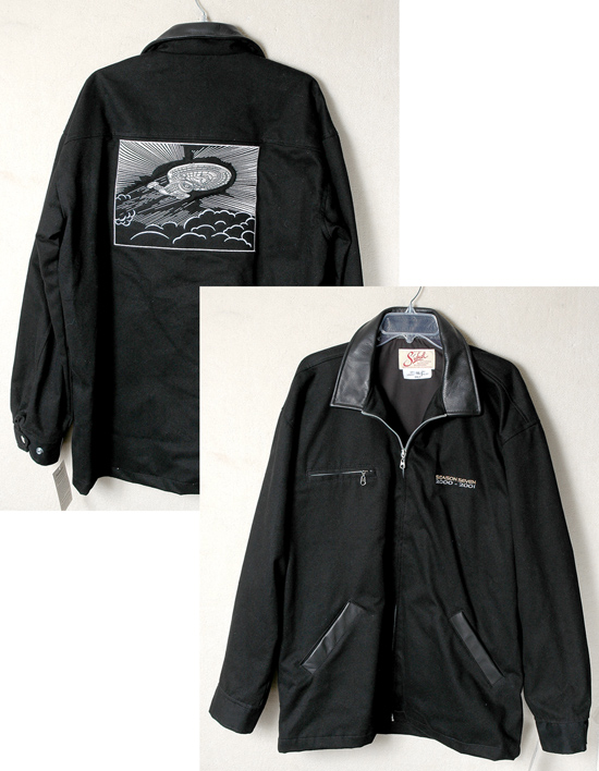 Black denim jacket with leather trim, size XL, "Season Seven / 2000-2001" in gold and silver on the front left side. A fantastic silver image of the U.S.S. Voyager is embroidered on the back. Made by Sichel Embroidered Crew Apparel. Fine condition. Make-up artist Michael Westmore signed in silver marker … |