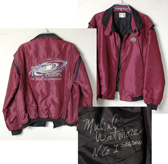 Black cotton-blend jacket embroidered in blue on the front right side: "Star Trek The Next Generation" and "Michael" on the left side. A colorful image of the U.S.S. Enterprise is embroidered on the back. Fine condition. Make-up artist Michael Westmore signed in black marker on the inside right side. Personal … |