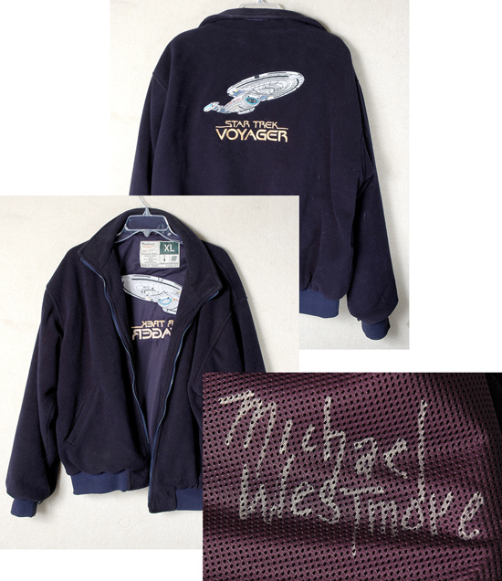 Navy fleece jacket, size XL, with a large silver and milti-colored patch of the U.S. Enterprise on the back and "STAR TREK: VOYAGER" in gold letters below. Michael Westmore signed in silver marker on the inside right. Fine condition. Star Trek: Voyager was the only Star Trek television series to … |