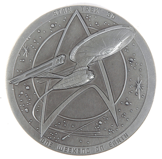 2 7/8" diameter medallion made by Paramount Pictures commemorating the 30th anniversary of Star Trek. On one side is the starship Enterprise. On the other side is "Star Trek / One Weekend on Earth / 30 /1996" followed by a calender, with the weekend of Sept. 7 and 8 circled, … |