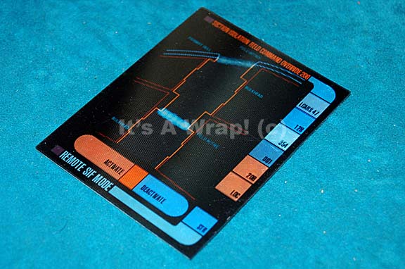 A display graphic for a tricorder created for Star Trek X: Nemesis during the scene in which “Data” (Brent Spiner) leaps from the “USS Enterprise-E” and “Geordi LaForge” (LeVar Burton) disables a force field to allow him to do so. The item depicts the location of a pair of force … |
