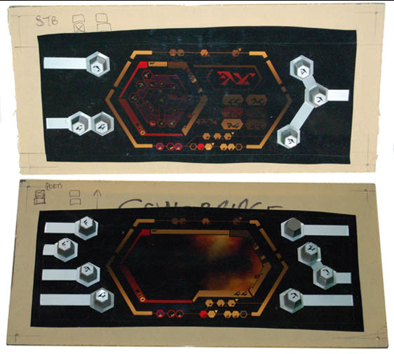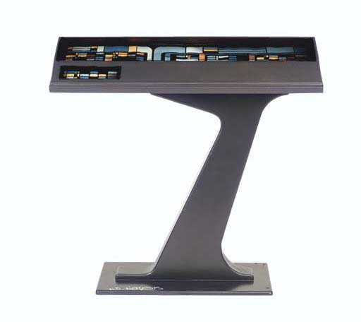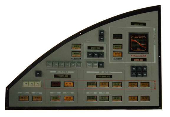 The portside forward station console, with backlit control graphics in the Starfleet LCARS style, internal backlit florescent fixtures [untested], sheet metal and wood construction finished as metallic bronze-pewter, open space in forward panel allows for installation of LCD computer display screen - 36x44x58in. - used on the bridge set of … |