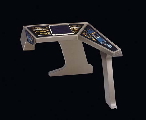 The portside forward station console, with backlit control graphics in the Starfleet LCARS style, internal backlit florescent fixtures [untested], sheet metal and wood construction finished as metallic bronze-pewter, open space in forward panel allows for installation of LCD computer display screen - 36x44x58in. - used on the bridge set of … |