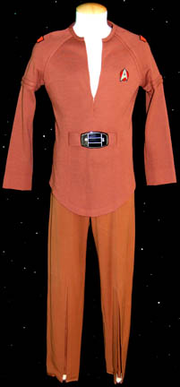 A brown colored Class-B Starfleet uniform featured in Star Trek I: The Motion Picture. The costume is a set of brown trousers with a matching long sleeved top that features an affixed bio-monitor, engineering red backed Starfleet emblem patch on the left breast and a pair of red division strips … |